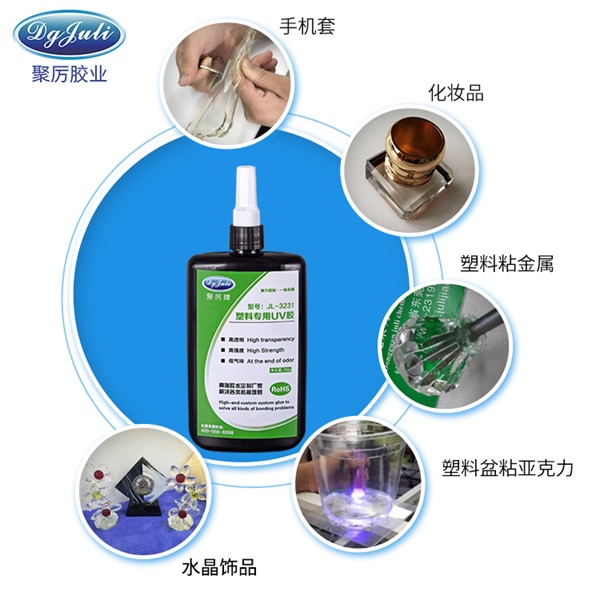 聚厲牌JL-3231塑料UV膠水屬于丙烯酸酯類膠粘劑采用進口原材料,應用于全透明塑料、工藝品主要PMMA(亞克力)、PC、ABS、PVC、PS、強度比市面上大多數(shù)UV膠有百分之三十五以上提高透明度以及強度,等透明塑料材質(zhì)的粘接有很好的耐腐蝕性好,耐酸堿,耐老化、抗震動等優(yōu)點。