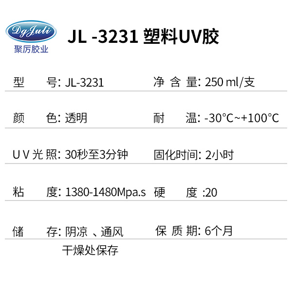 聚厲牌JL-3231塑料UV膠水屬于丙烯酸酯類膠粘劑采用進口原材料,應用于全透明塑料、工藝品主要PMMA(亞克力)、PC、ABS、PVC、PS、強度比市面上大多數(shù)UV膠有百分之三十五以上提高透明度以