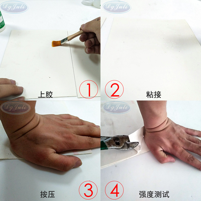 3、JL-268透明PVC膠水黏接無孔材料時,在被黏物表面均勻涂抹PVC塑料粘合劑,雙面涂膠的需要晾3-5分鐘,單面涂膠的無需晾置馬上把粘結(jié)面對準(zhǔn)粘合到一起并壓實1~2小時達(dá)到一定強(qiáng)度,24小時后可達(dá)到高強(qiáng)度。